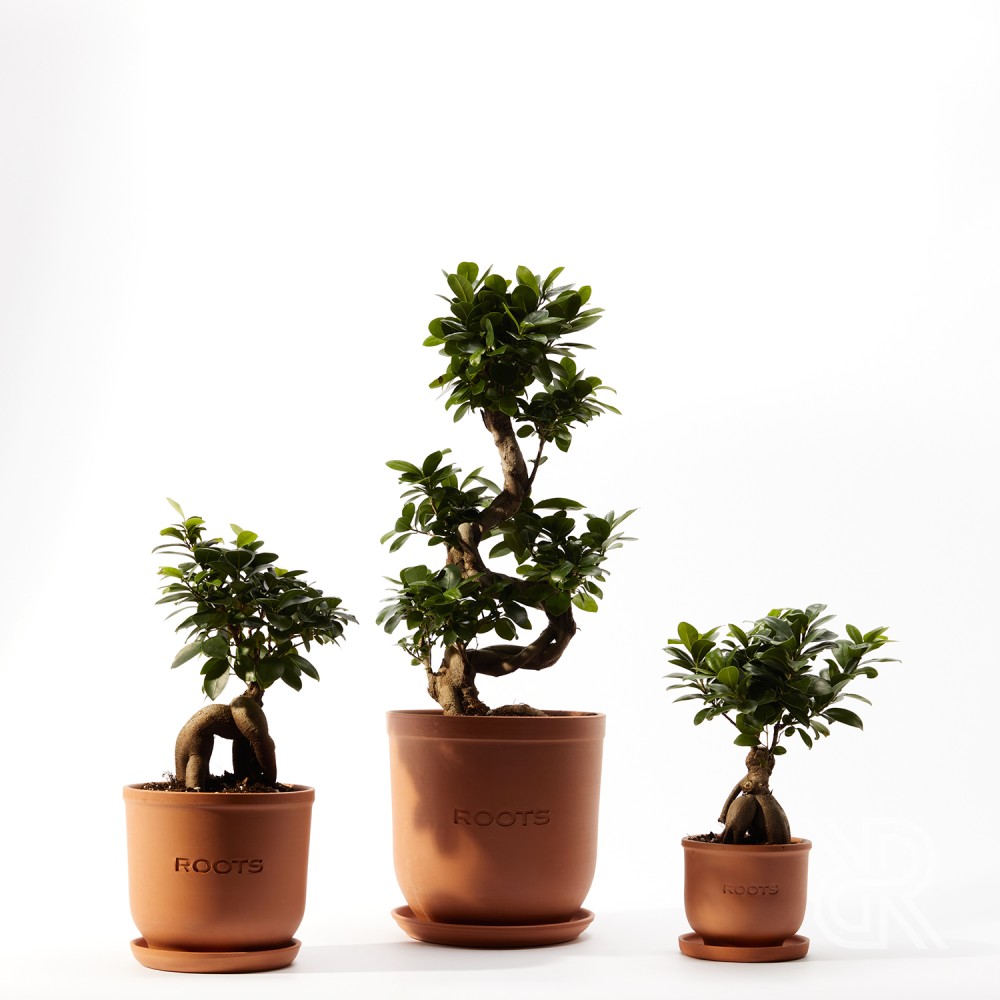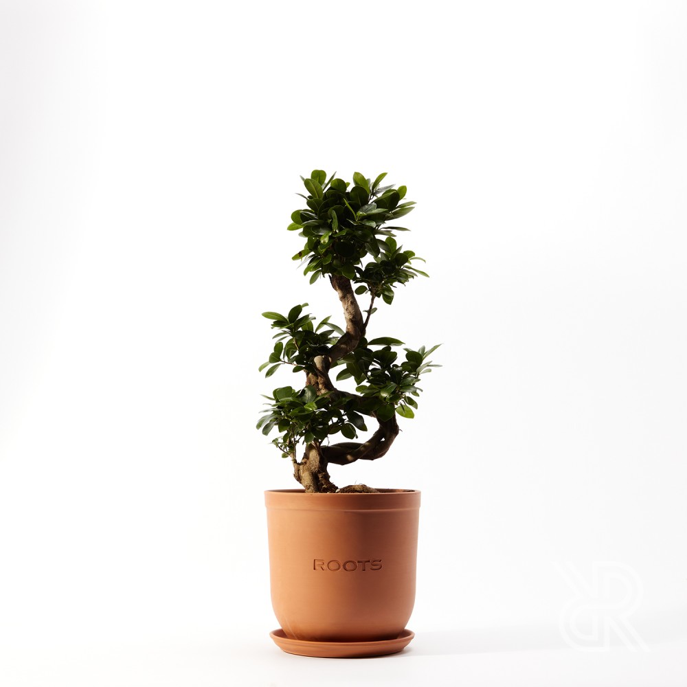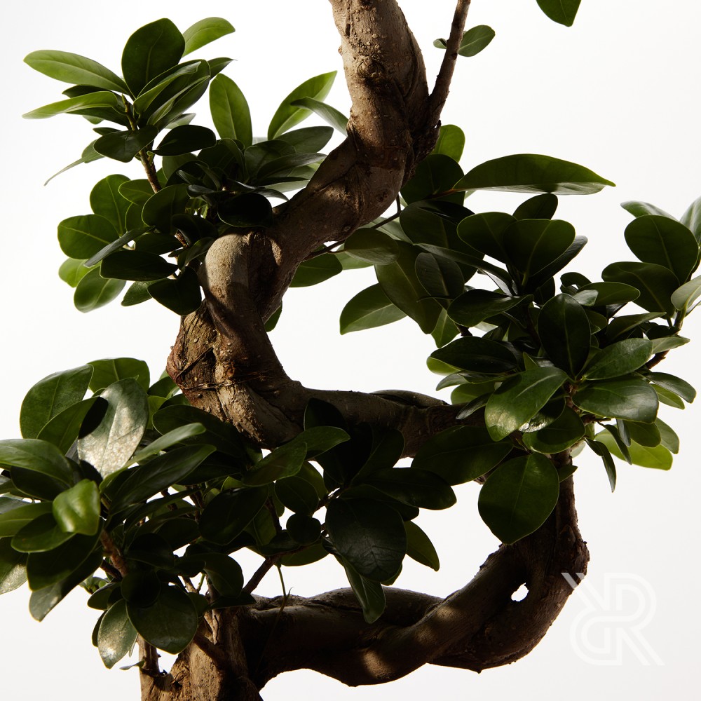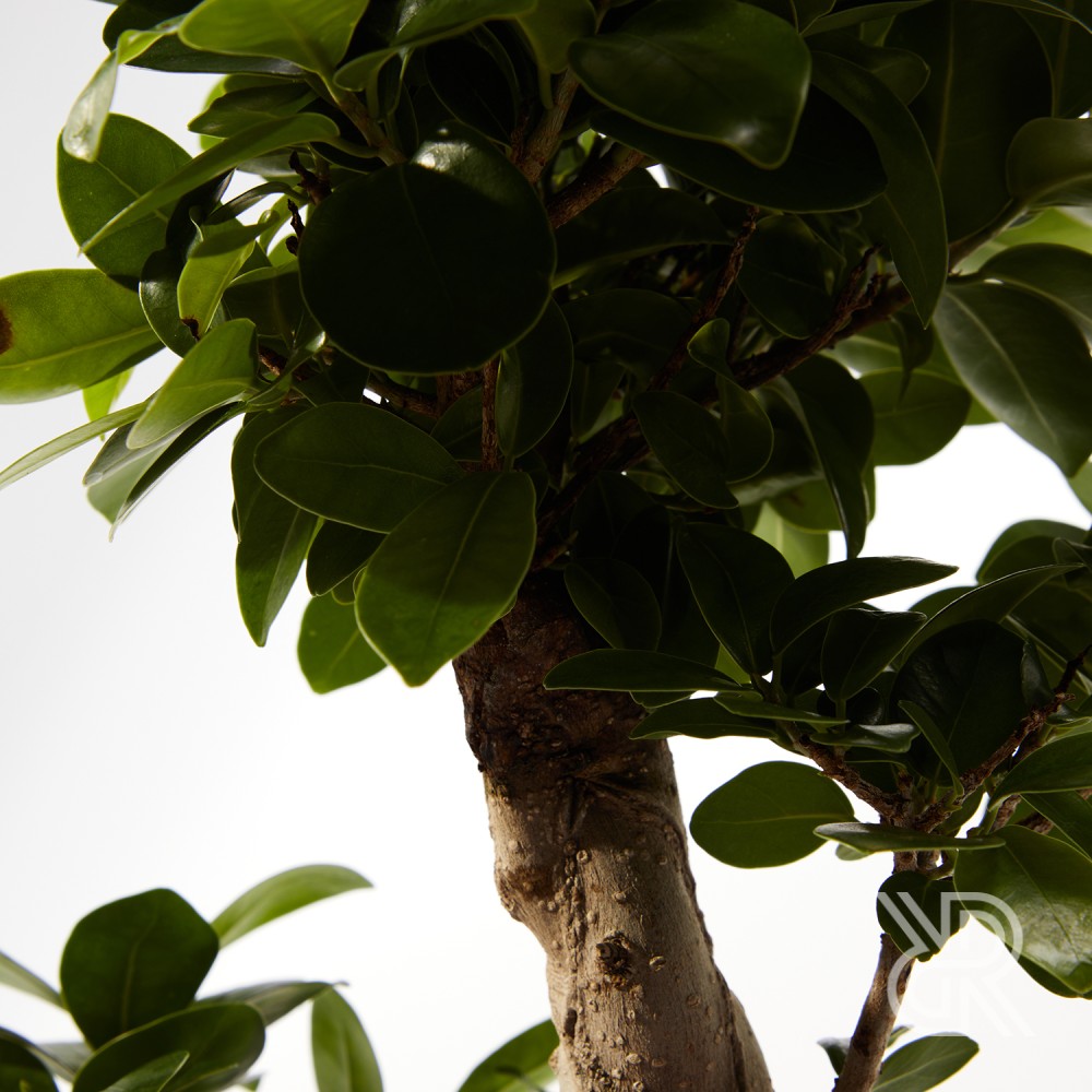 Стильное декоративное растение. Характеризуется тем, что снизу его ствола имеется выраженное утолщение, сформированное из воздушных корней, которое со временем может принимать самые затейливые формы, листья - заостренной формы, гладкие, глянцевые и блестящие. В домашней среде фикус может достигать 1,5 метров, хотя растет он не быстро. Способствует очищению воздуха от различных вредных соединений углерода, к примеру: фенола, бензола и формальдегида. При правильном несложном уходе можно получить мини-деревце с красиво оформленной и пышной кроной. Главное, правильно подобрать место нужной освещенности и не перемещать растение, а также проводить своевременную обрезку с целью формовки кроны и ствола.