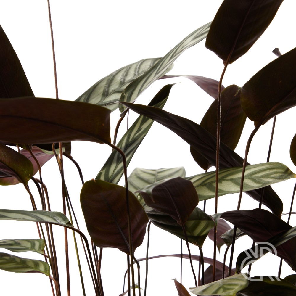 Ктенанта Сетоса - яркое декоративно-лиственное растение. Характеризуется эффектными вытянутыми листьями яйцевидной формы на изящных тонких черешках. Полоски, расположенные на листьях окрашены в сизый, либо светло-зеленый цвет и расходятся от средней жилки в виде мазков, словно сделаны кистью. В высоту растение может достигнуть 80 см. Интересная особенность ктенанты — это большая подвижность листьев, следуя за лучами солнца, они могут опускаться и подниматься. Ктенанта - довольно прихотливое, требовательное растение, очень страдающее от сухого воздуха и сквозняков. Диаметр около 17 см, высота около 50 см.