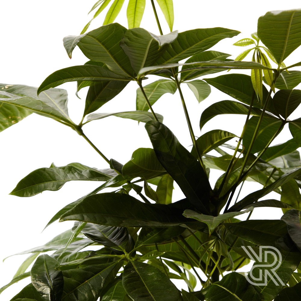 Пахира Акватика - стильное долговечное неприхотливое растение. Молодые побеги остаются гибкими в течение длительного времени и идеально подходят для плетеного формирования ствола из 2-3 посаженных рядом саженцев. Ствол утолщенный у основания и служит для хранения воды на случай засухи, а блестящие зеленые резные листья образуют на вершине широкую крону. Молодые побеги растут быстро и в домашних условиях пахира обычно вырастает до 1-2 метров, но ее рост успешно контролируется обрезкой и размером горшка. Уход несложен, но выходец из тропиков требует микросреды, приближенной к его природным местам произрастания - нужно большое количество солнечного света и регулярный полив. Диаметр около 17 см, высота около 70 см.