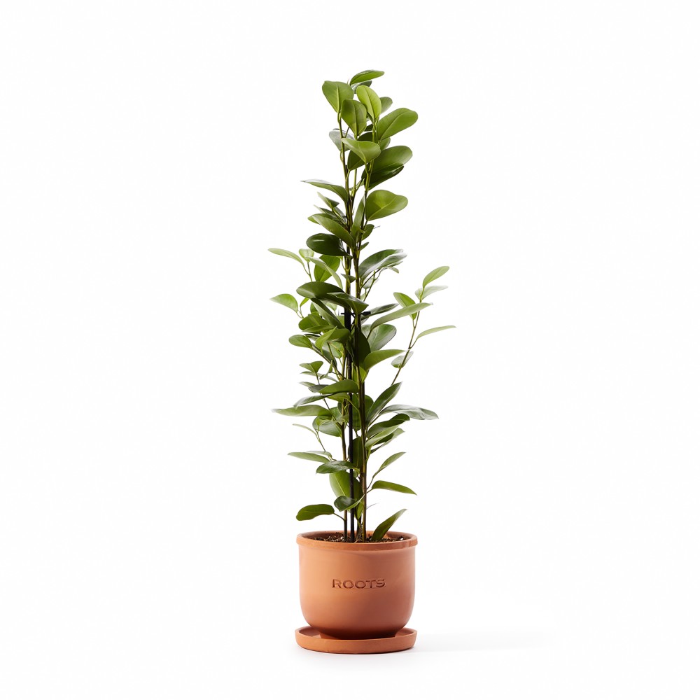 Растение доставляется в глиняном брендированном горшке терракотового оттенка и требует последующей пересадки в емкость большего размера, в специализированный грунт. Глиняный горшок может быть повторно использован для посадки комнатных растений меньшего размера.