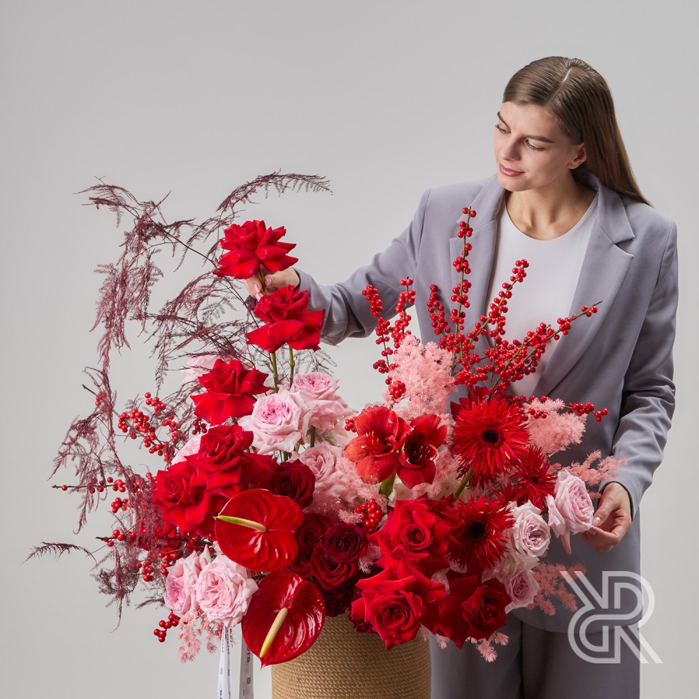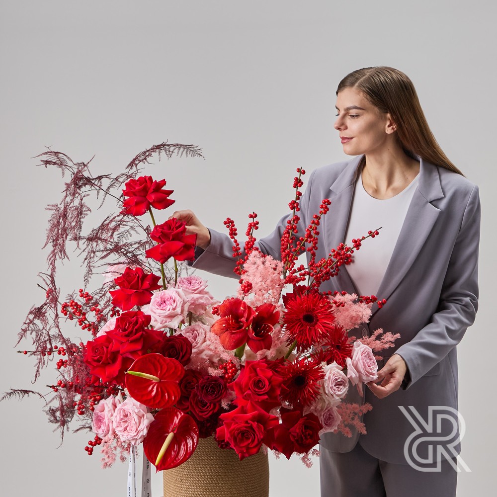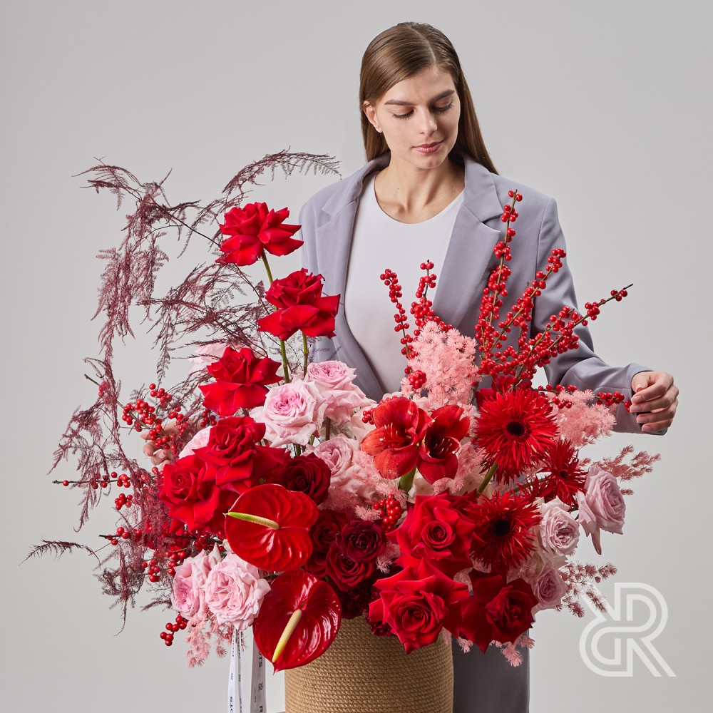 Яркая композиция в корзине в розово-красной цветовой гамме. В составе: амариллис, розы сортов Эксплорер и О Хара, гортензия, герберы, диантус, ягодный илекс, антуриумы и аспарагус. Корзина украшена декоративными лентами.
