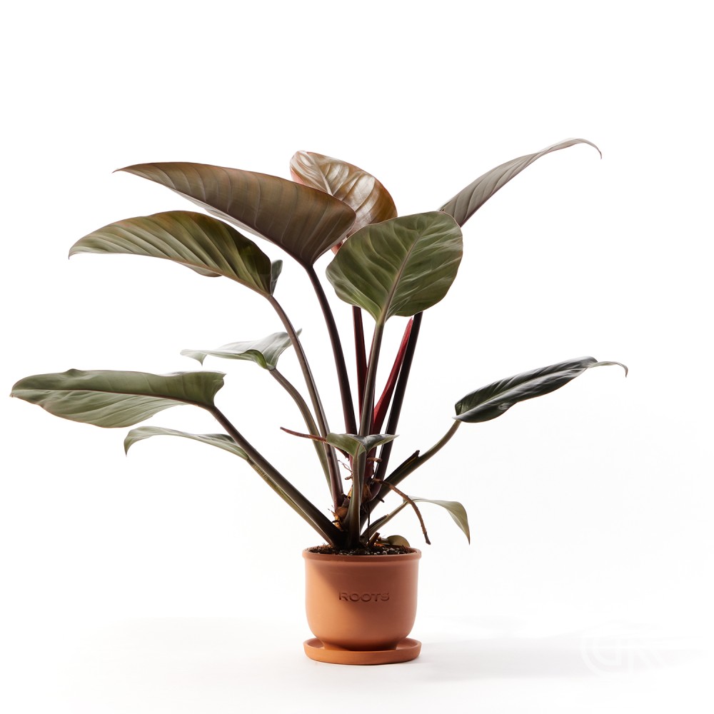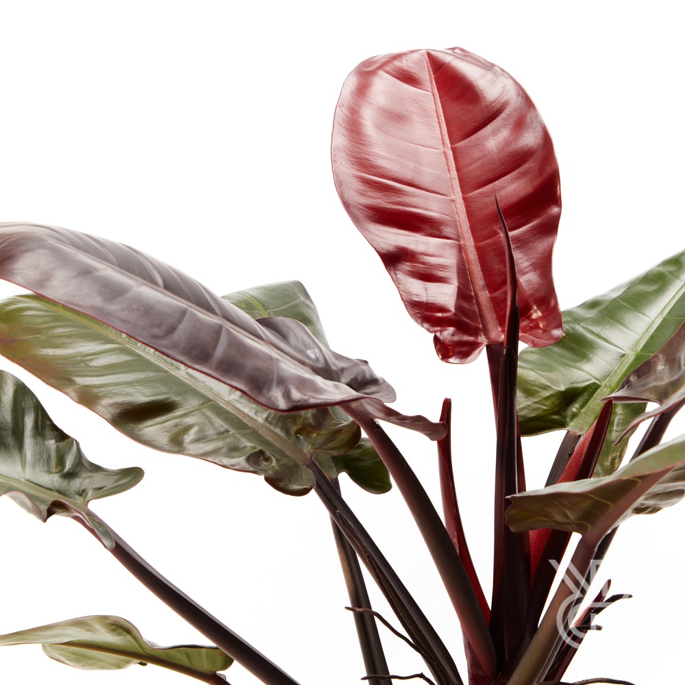 Стильное декоративно-лиственное растение. Редкий, коллекционный вид филодендрона с уникальной окраской, который растет достаточно медленно. Характеризуется крупными глянцевыми листовыми пластинами сердцевидно-овальной формы с заостренным кончиком, расположенными на длинных побегах. Новые листья ярко-красные, со временем темнеют и становятся медными, а далее зеленого цвета. Черешки и стебли имеют интенсивный темно-красный окрас. Растет довольно густо и требует много места. Может достигать до одного метра в высоту, а длина листьев 25 см. Неприхотлив и прост в уходе - любит яркий рассеянный свет, высокую влажность воздуха и регулярный полив. Станет прекрасным украшением любого интерьера и подойдет начинающим цветоводам.