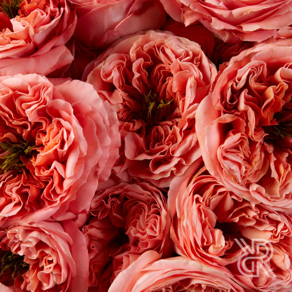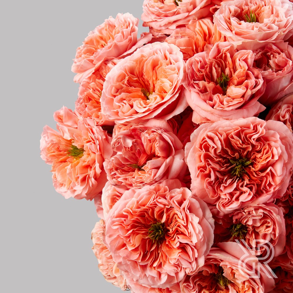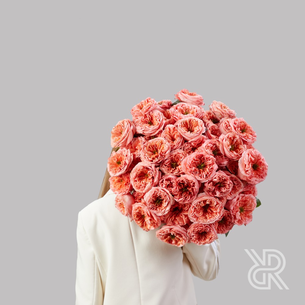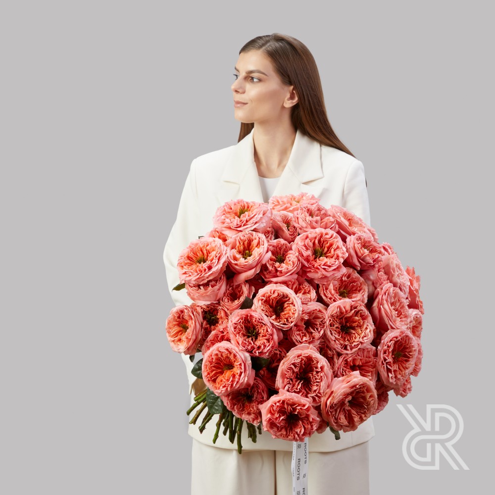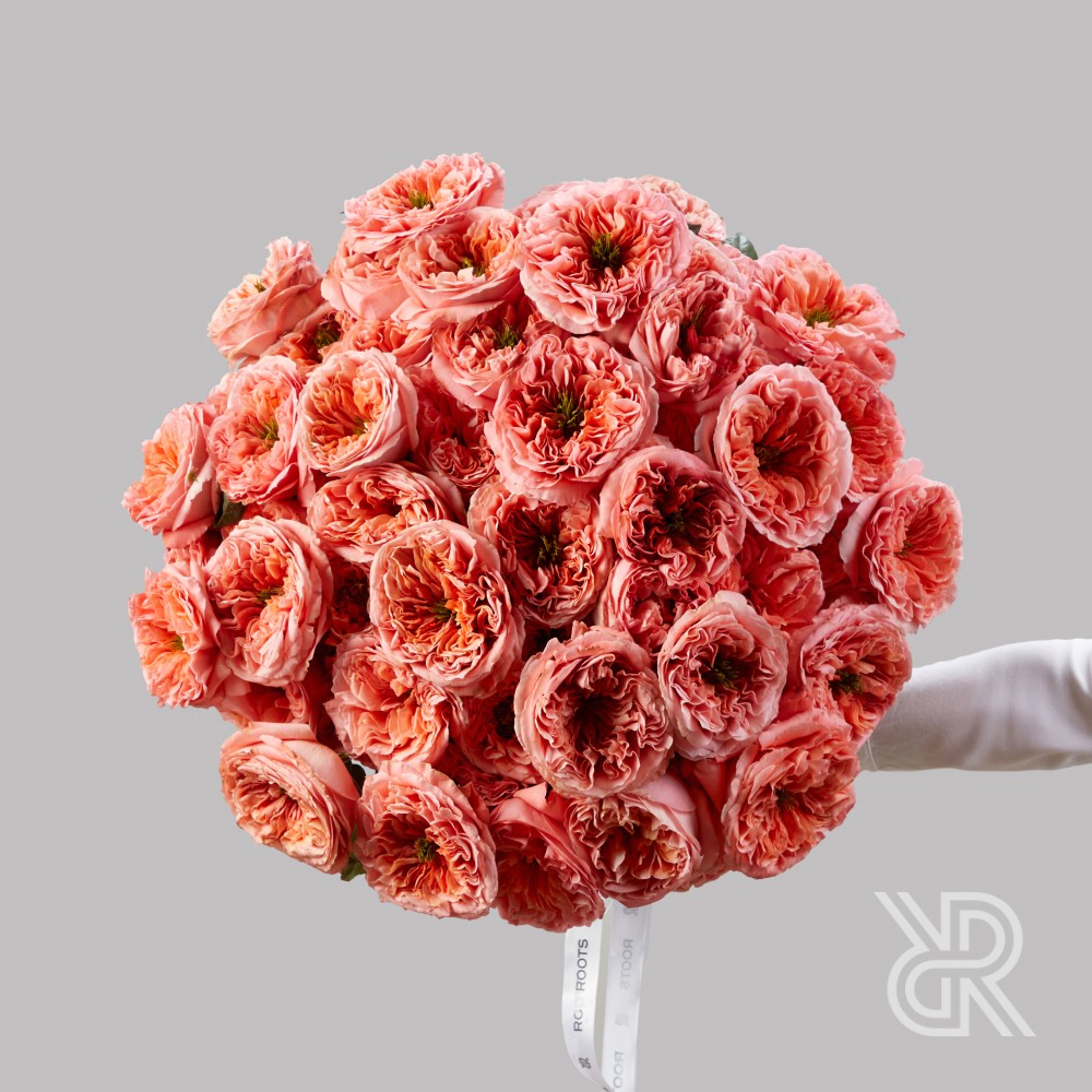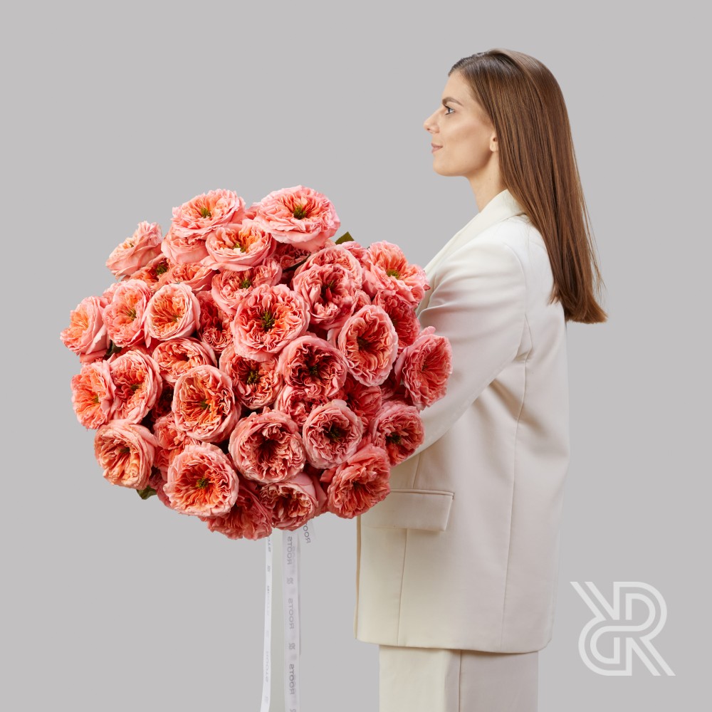 Монобукет из 75 пионовидных роз сорта Мандарин Экспрешн. Отличается необыкновенной формой бутона, состоящим из множества ярко-персиковых закрученных лепестков и  ярко-зеленой сердцевины. Характеризуется нежным, легким ароматом. Розы перевязаны декоративными лентами.