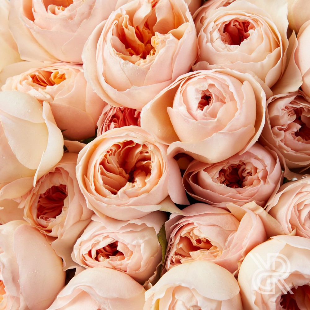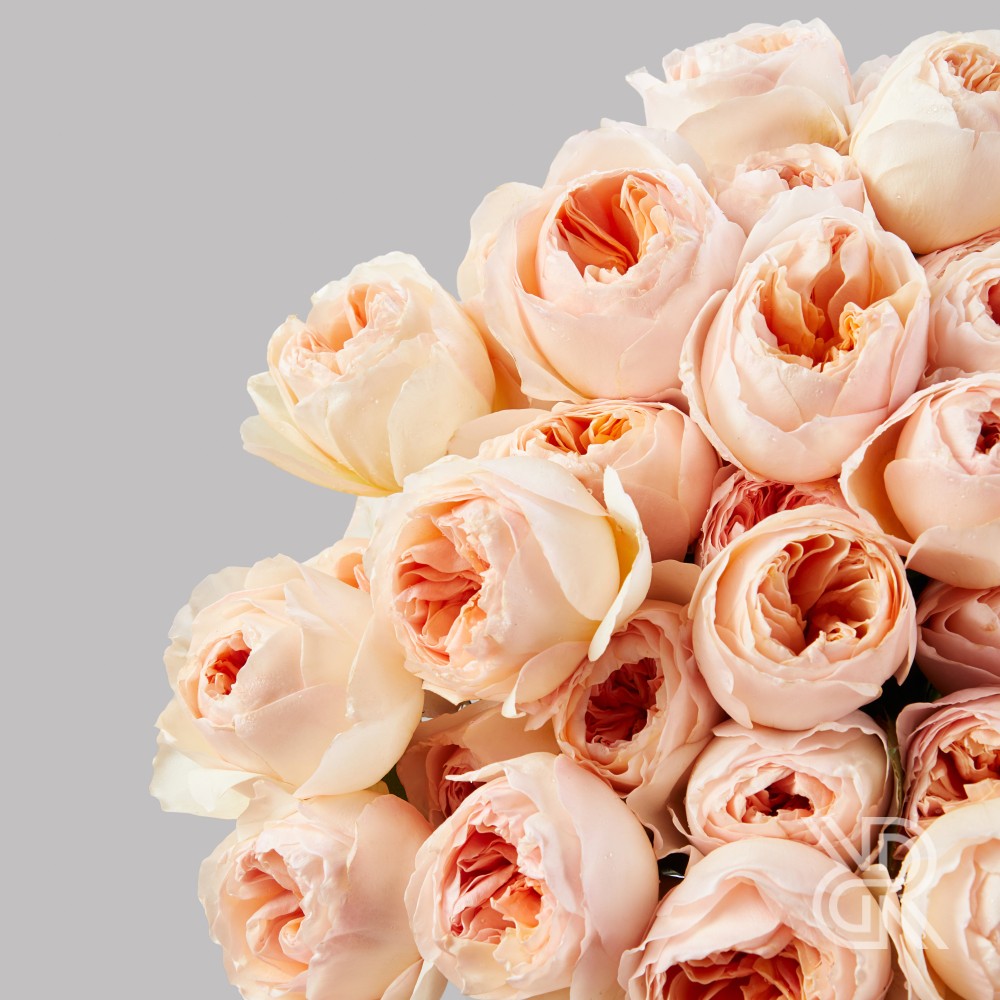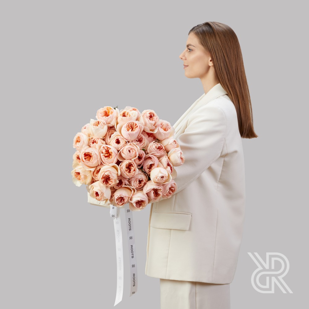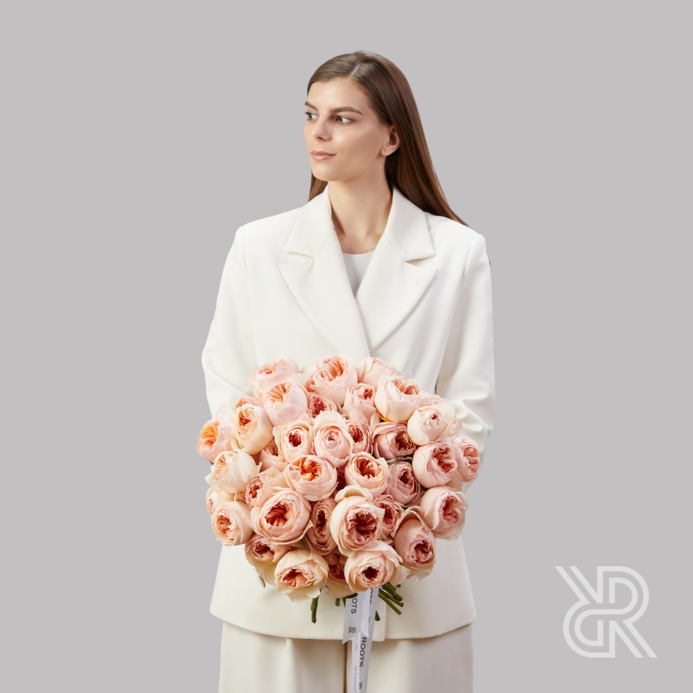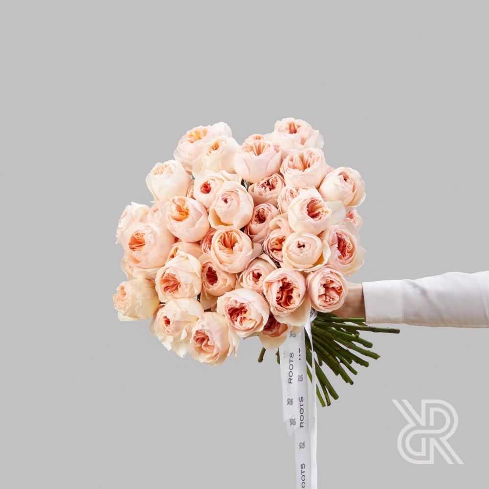Монобукет из 45-ти английских роз сорта Джульетта селекции Дэвида Остина. Роза сочетает в себе необычную красивую форму бутона, нежный персиковый оттенок и обладает легким ароматом. Розы перевязаны декоративной лентой.