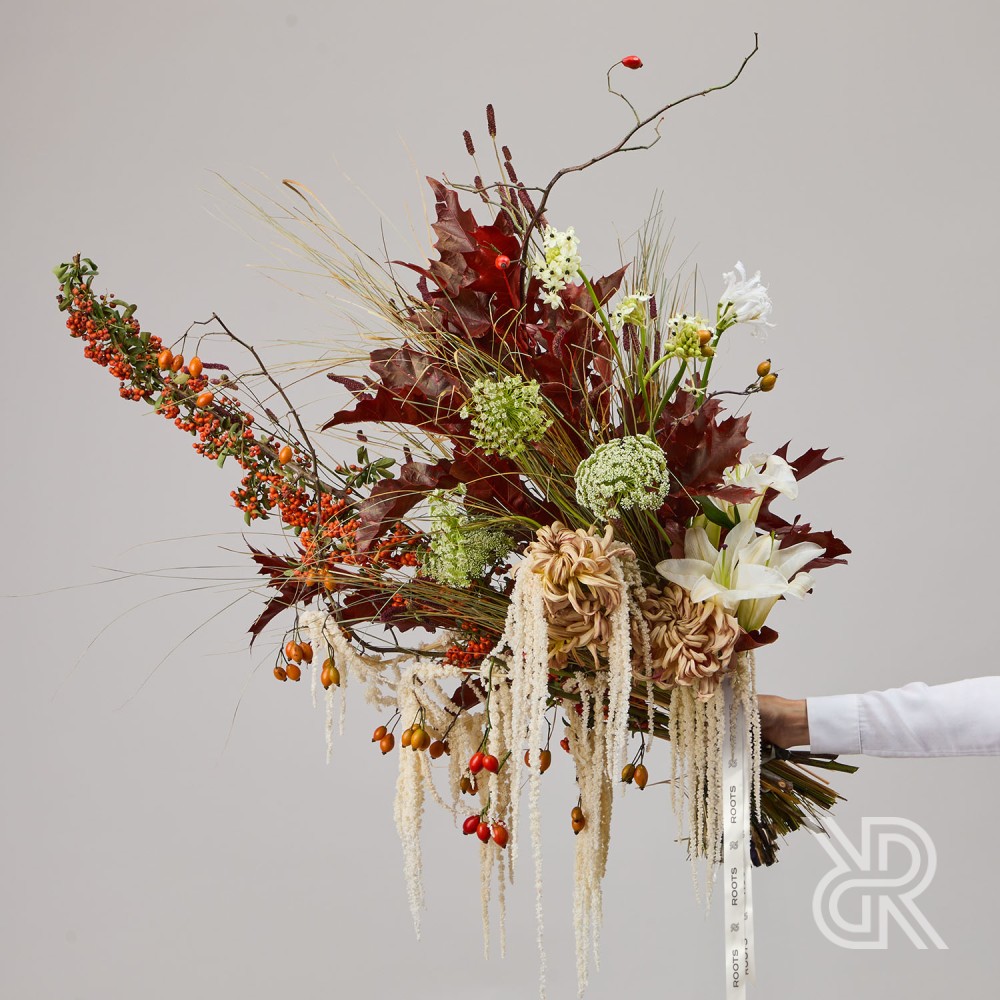 Яркий осенний букет в оттенках белого, кремового, оранжевого и винного. В составе: хризантемы, лилия, пираканта, шиповник, амми, орнитогалум, сангисорба, нерине, амарант и кверкус. Букет перевязан декоративными лентами.