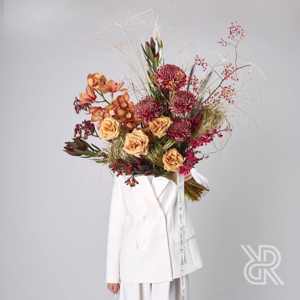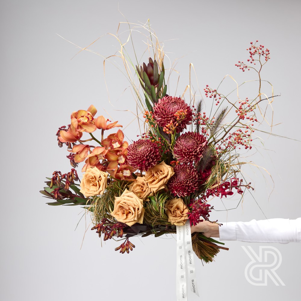 Яркий осенний букет в винно-кофейной цветовой гамме. В составе: хризантемы Виенна, пионовидные розы, орхидеи Цимбидиум и Ашима, шиповник, анигозантус, леукадендрон, пеннисетум, и травы. Букет перевязан декоративными лентами.