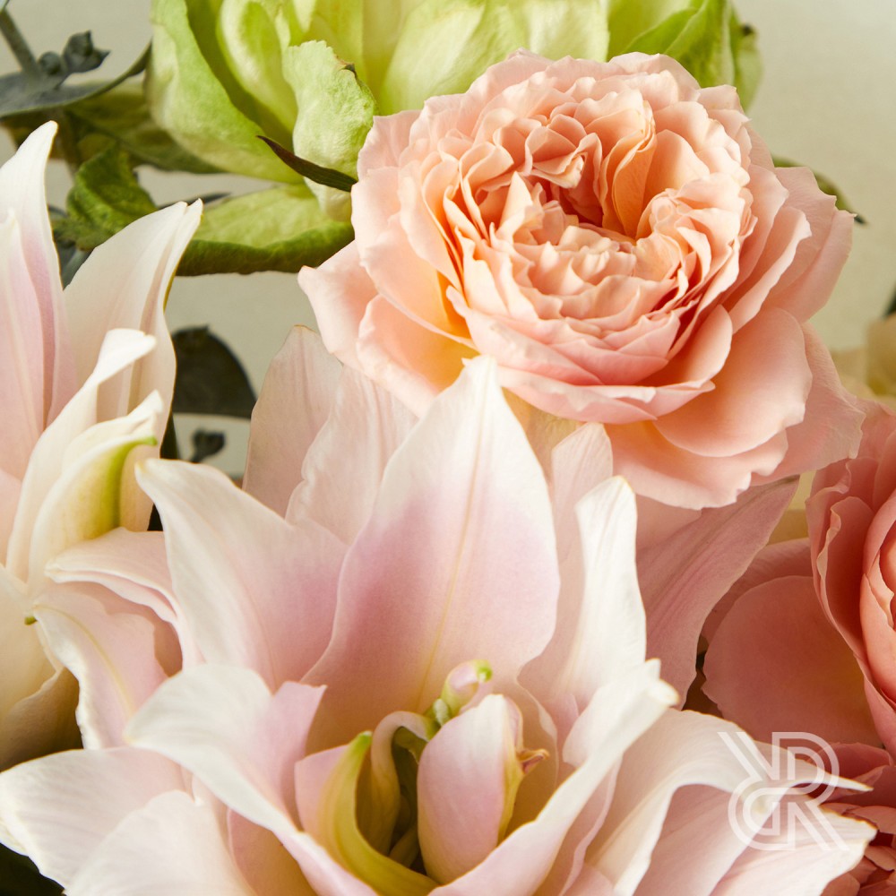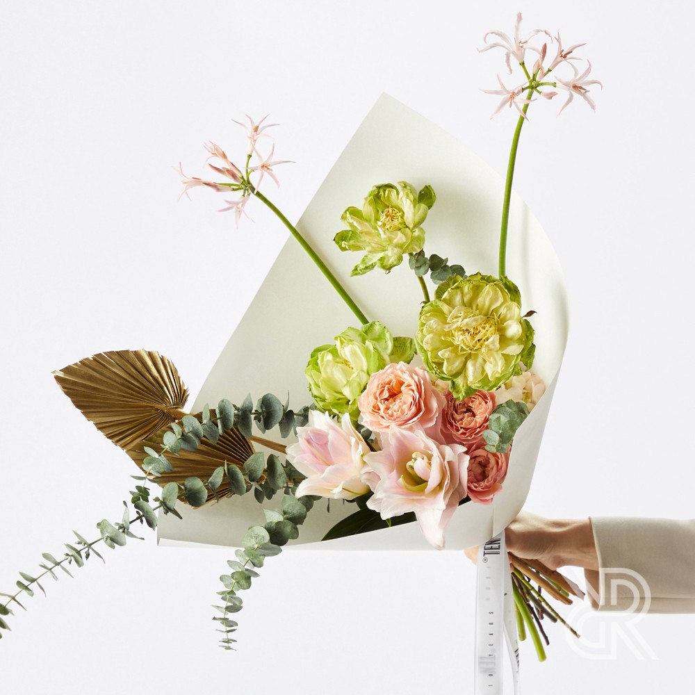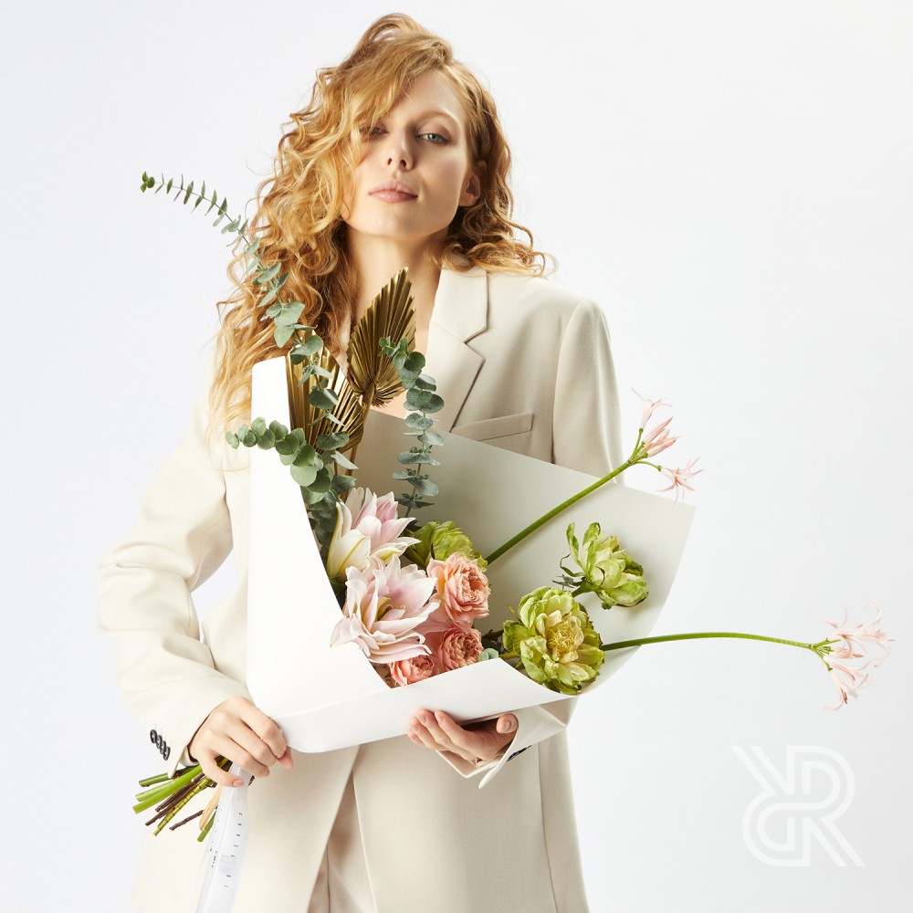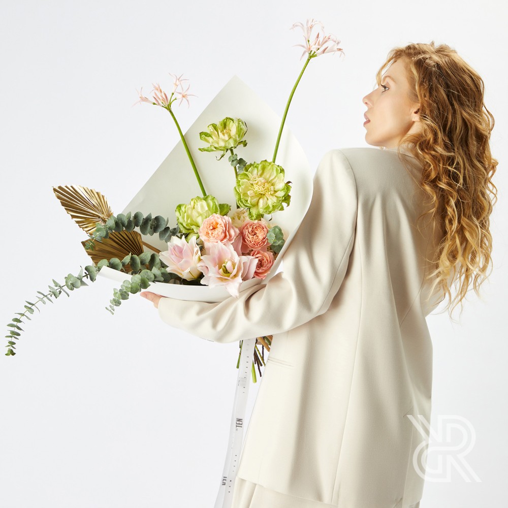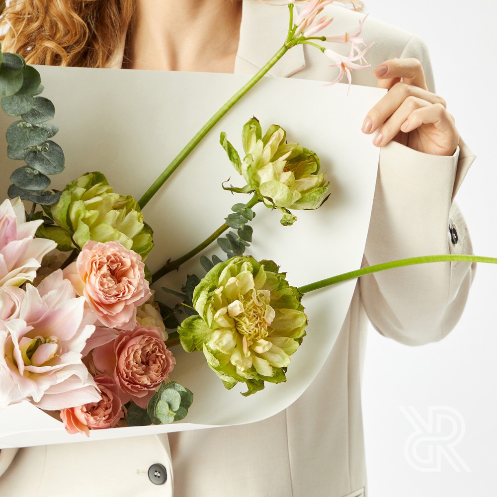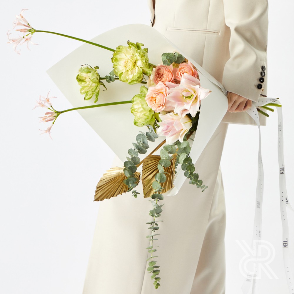 Лёгкий букет в пастельной гамме с акцентами зелени из коллекции TEN, посвящённой десятилетию ROOTS.