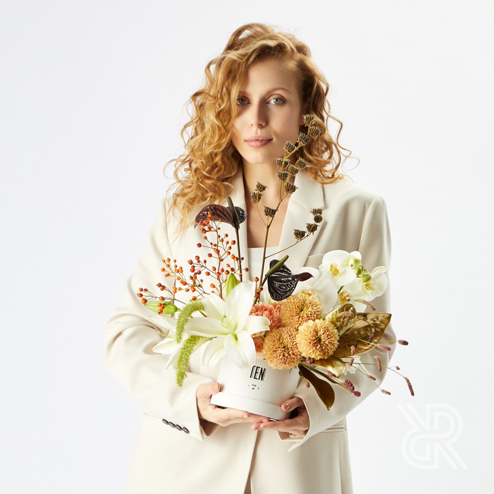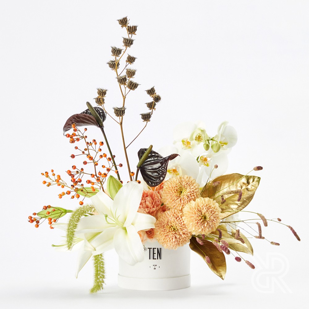 Композиция в коробке в тёплой осенней гамме с контрастом светлых и глубоких оттенков из коллекции TEN, посвящённой десятилетию ROOTS.