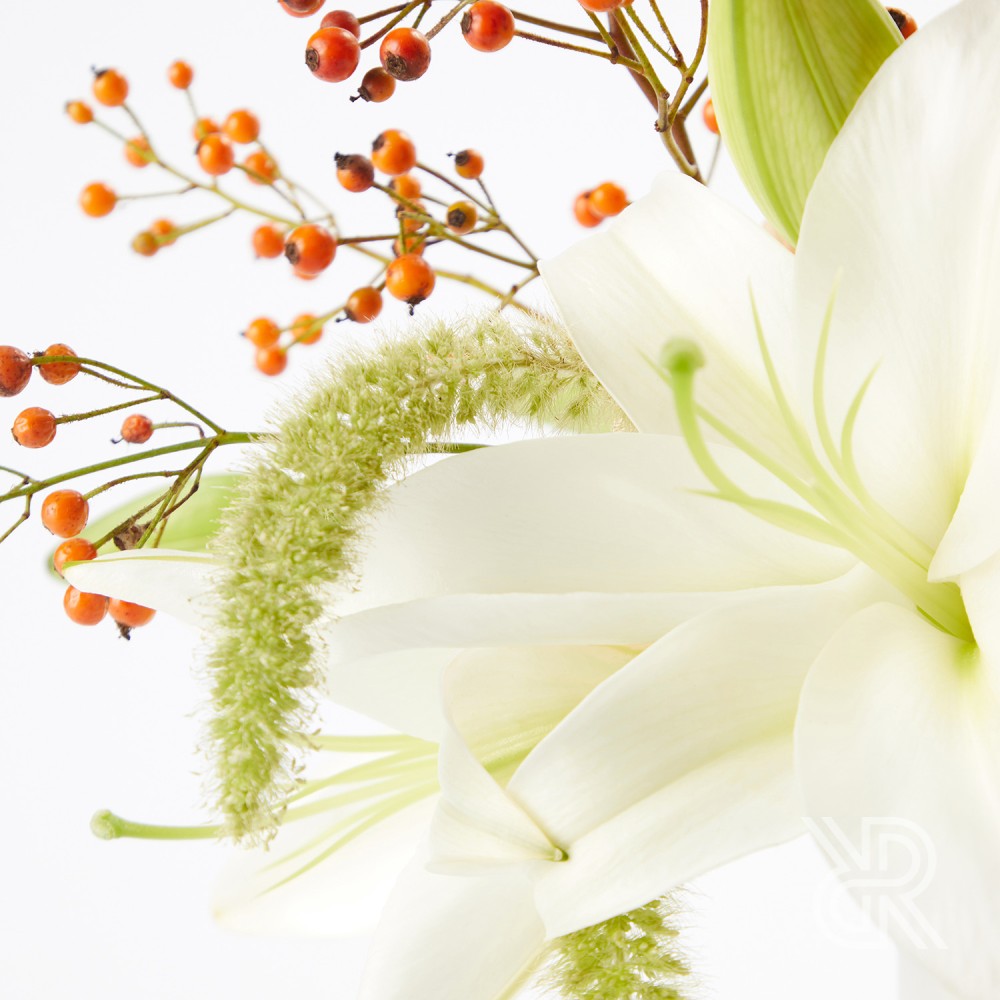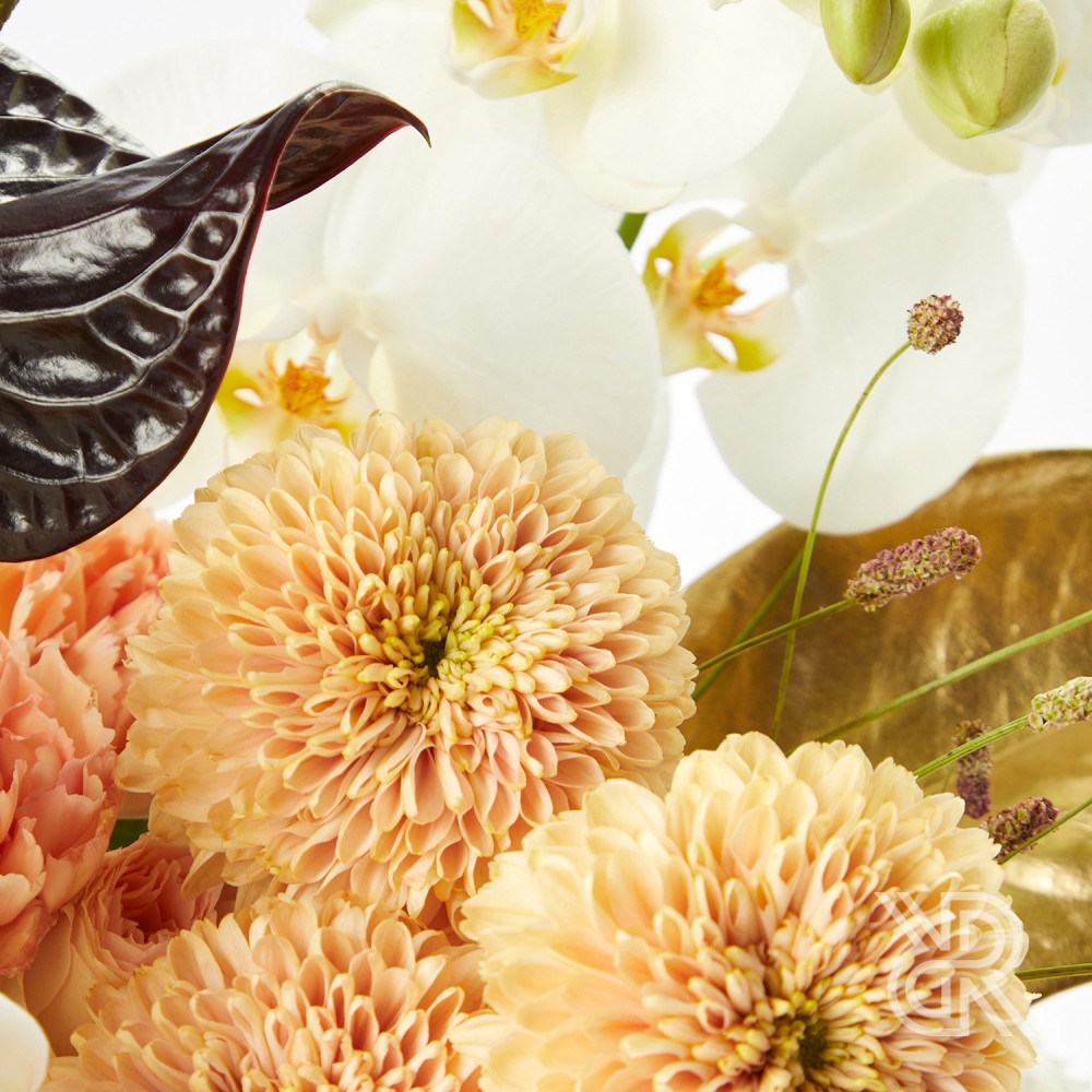 В составе: хризантемы, орхидея Фаленопсис, лилия, антуриум, диантус, кустовые розы, сетария, шиповник, сангисорба, канатник и золотые листья магнолии.