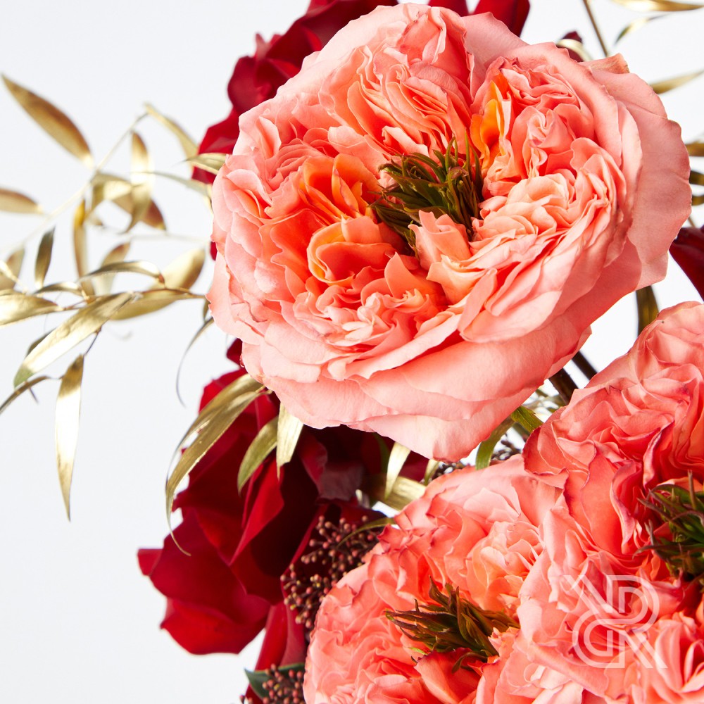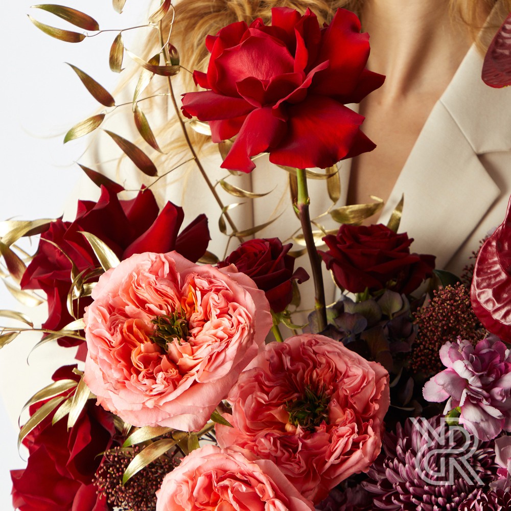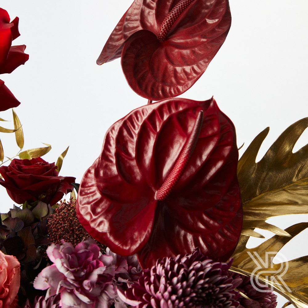 В составе: розы Мандарин и Эксплорер, гортензия, антуриум, хризантема Бигуди, диантус Гипноз, скиммия, лист филодендрона и золотой рускус.