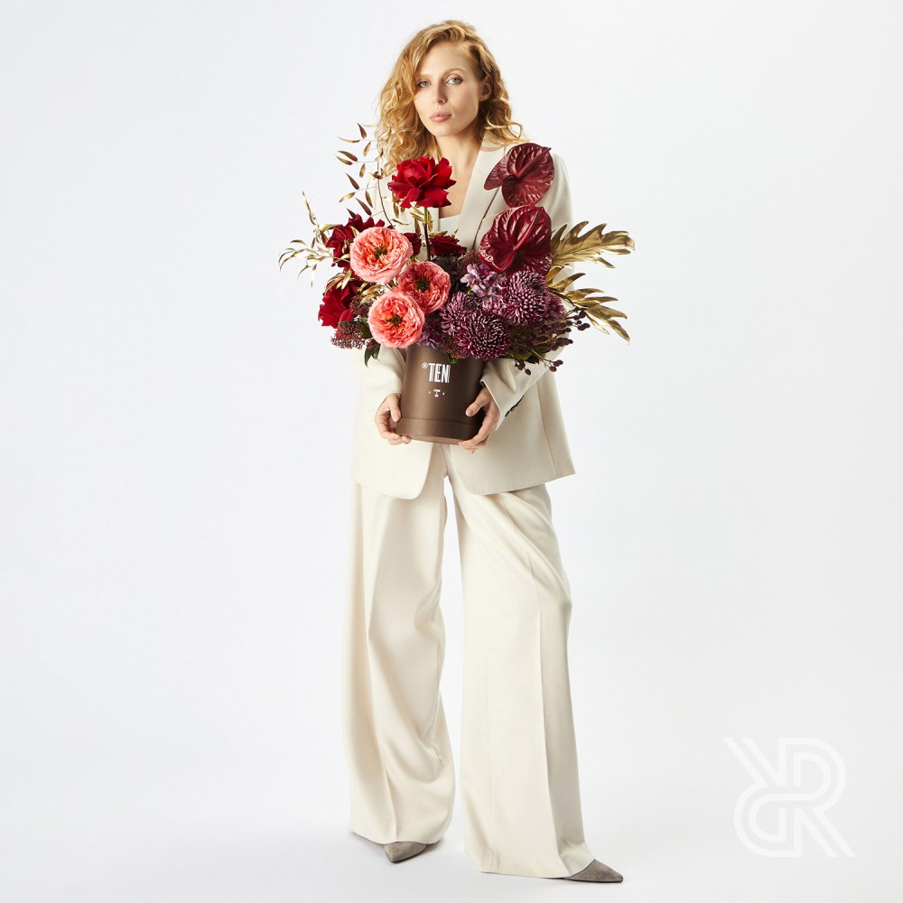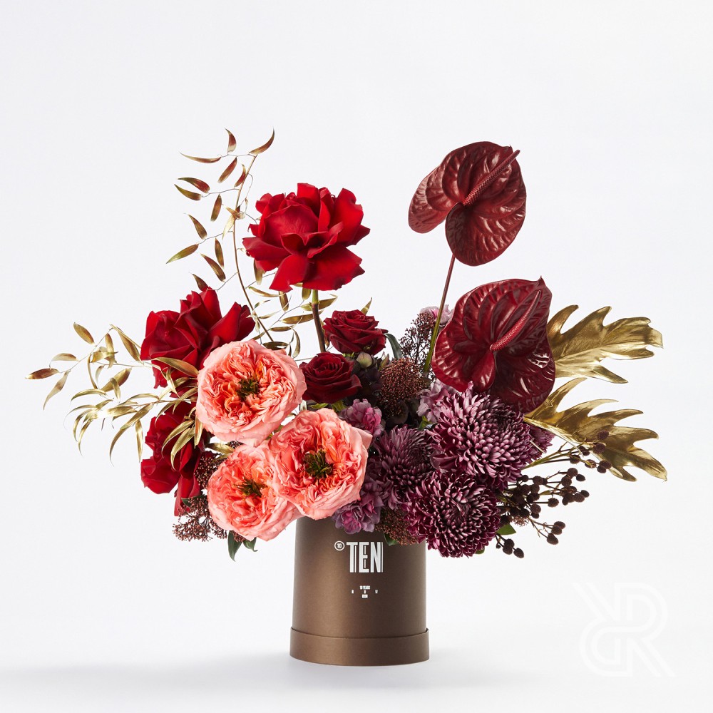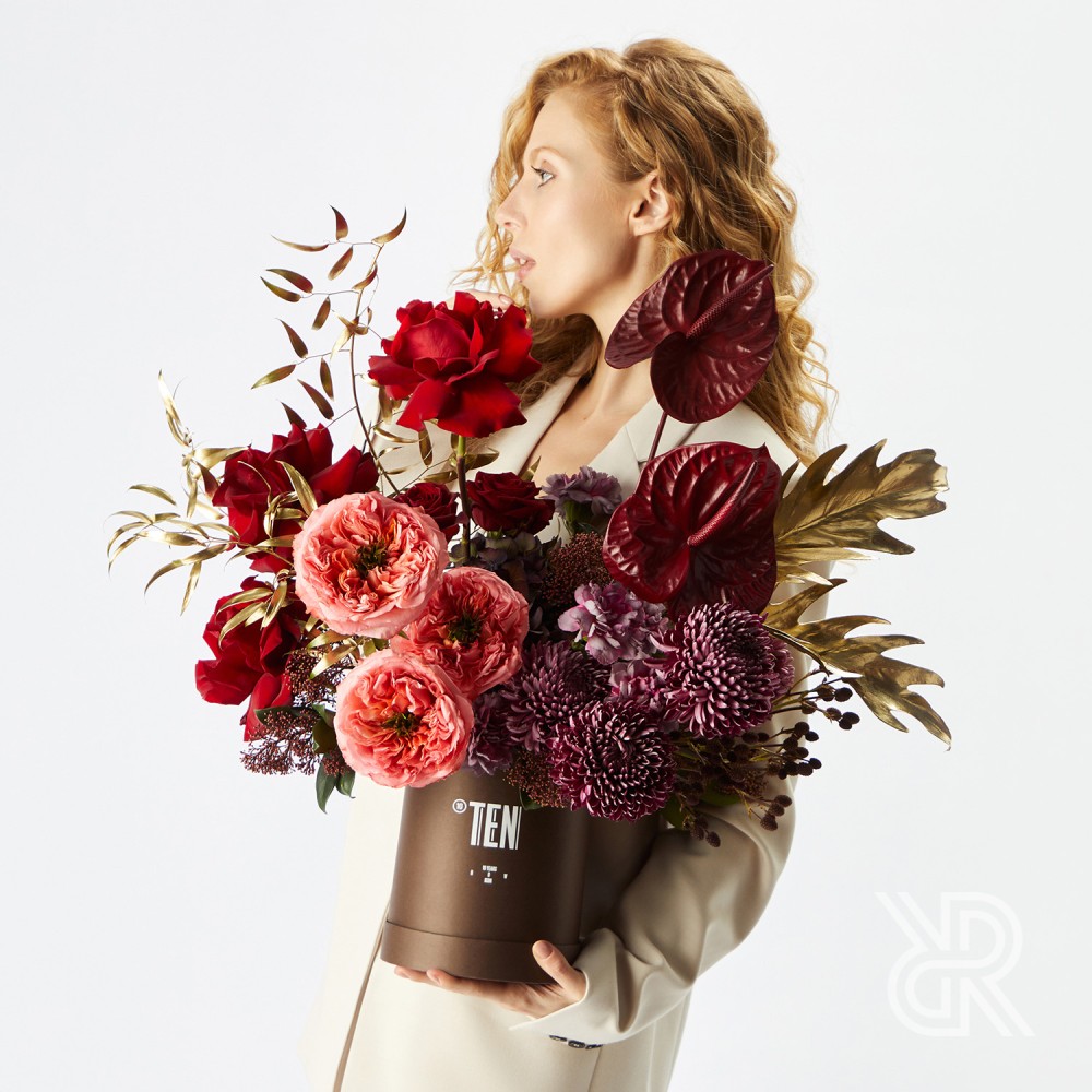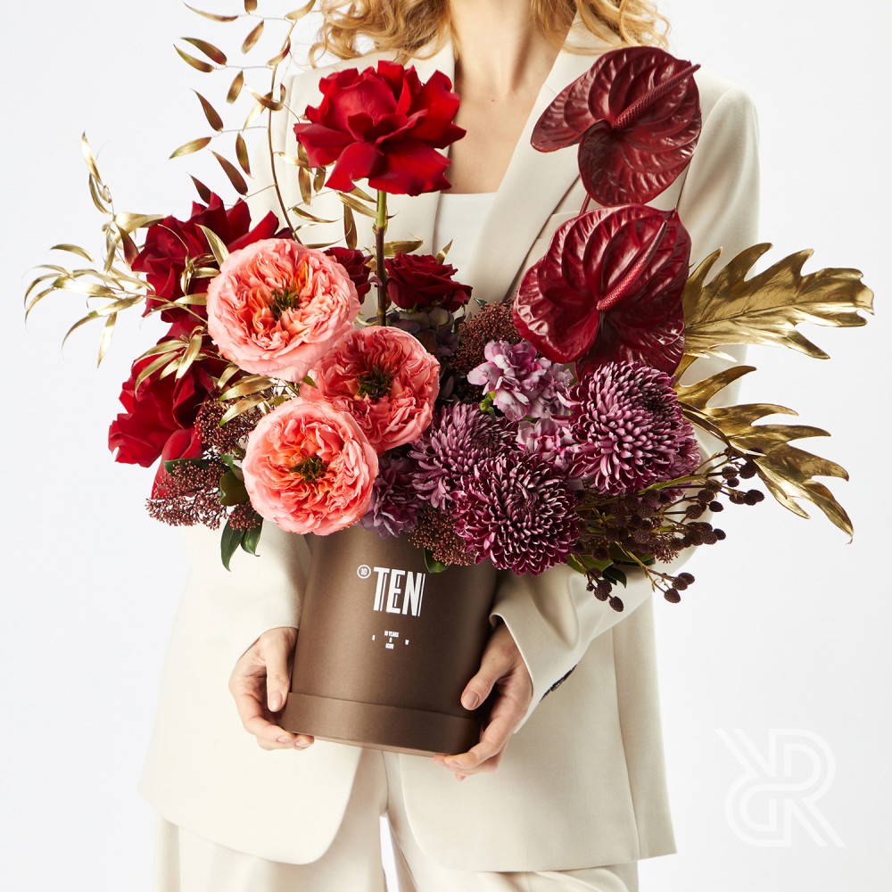 Глубокая композиция в коробке в красно-бордовой гамме с яркими акцентами из коллекции TEN, посвящённой десятилетию ROOTS.
