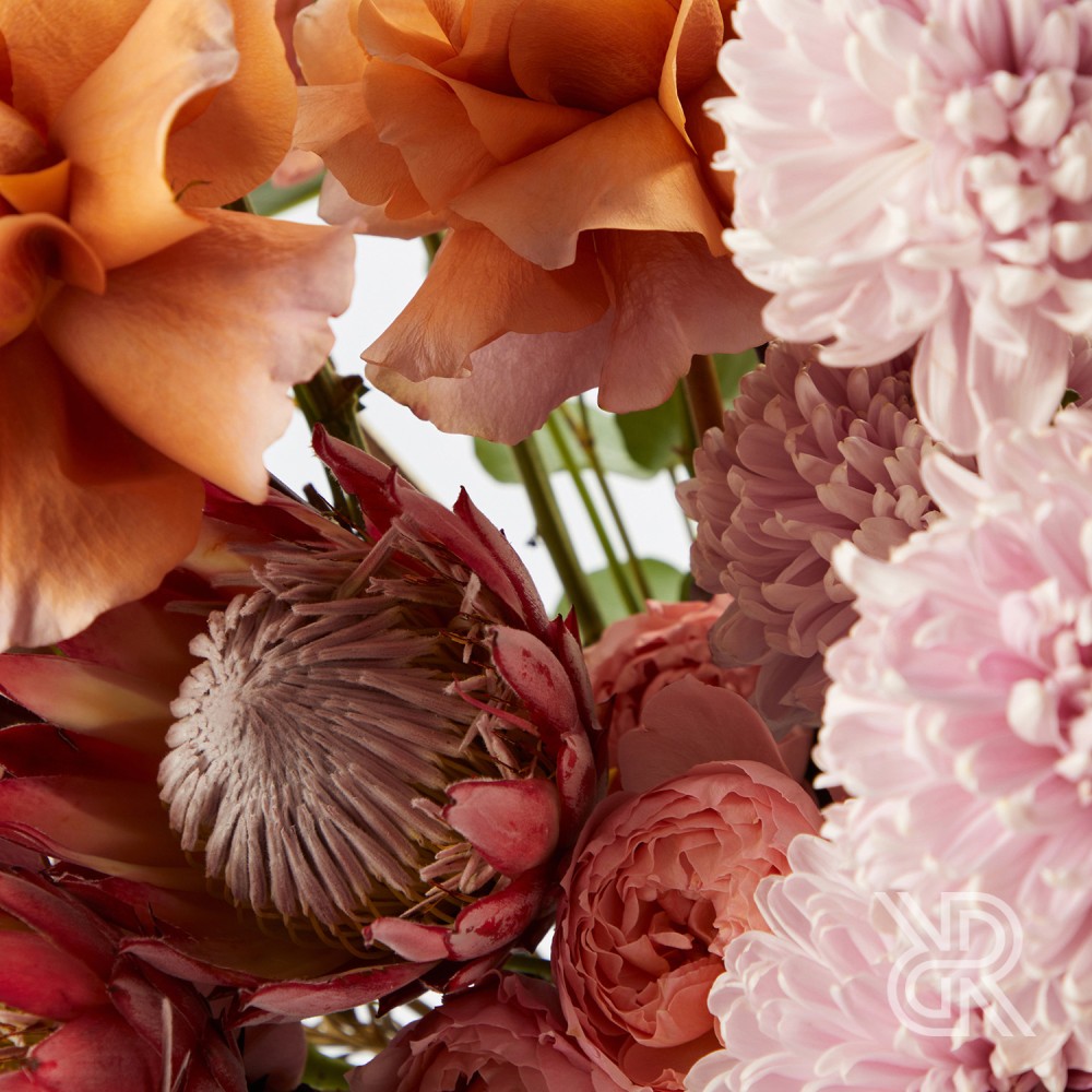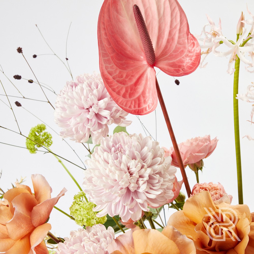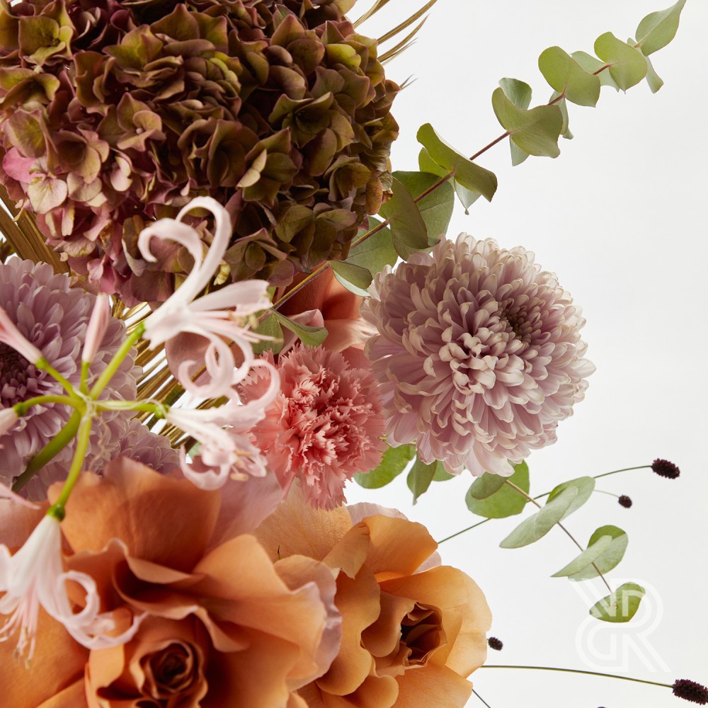В составе: хризантемы, розы Перпл Мун, гортензии, антуриумы, нерине, кустовые пионовидные розы Джульетта, диантус, вибурнум Розеум, сангисорьа, гревиллея, эвкалипт и лист пальмы.