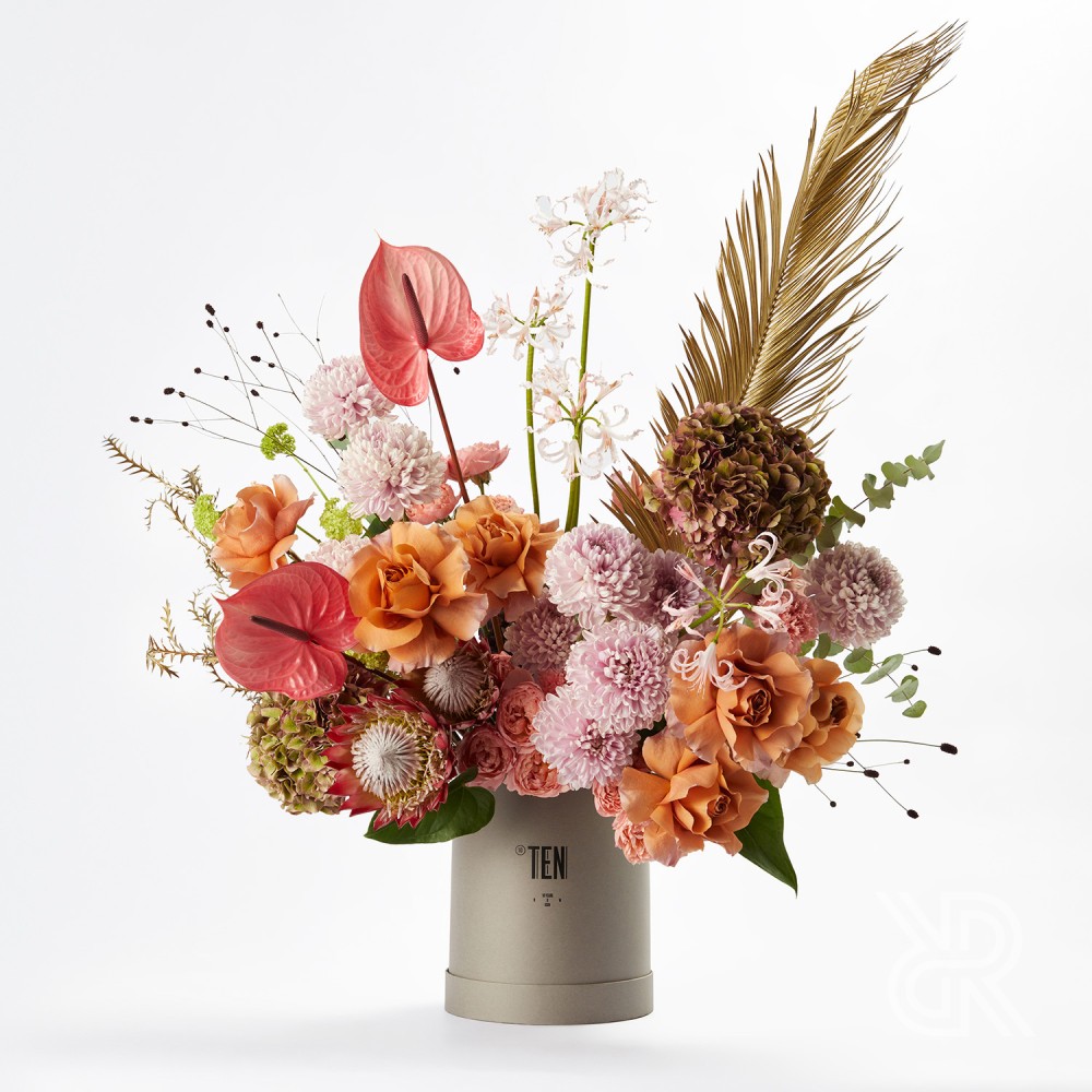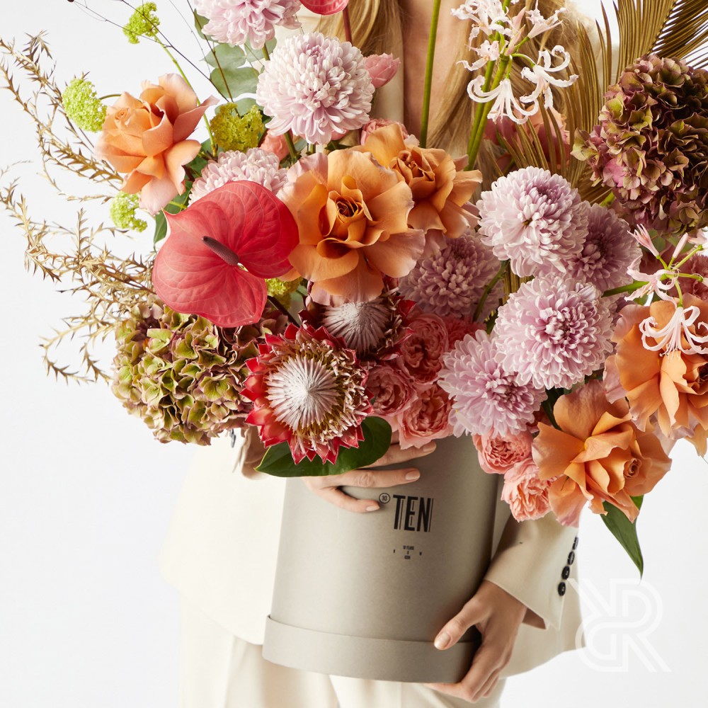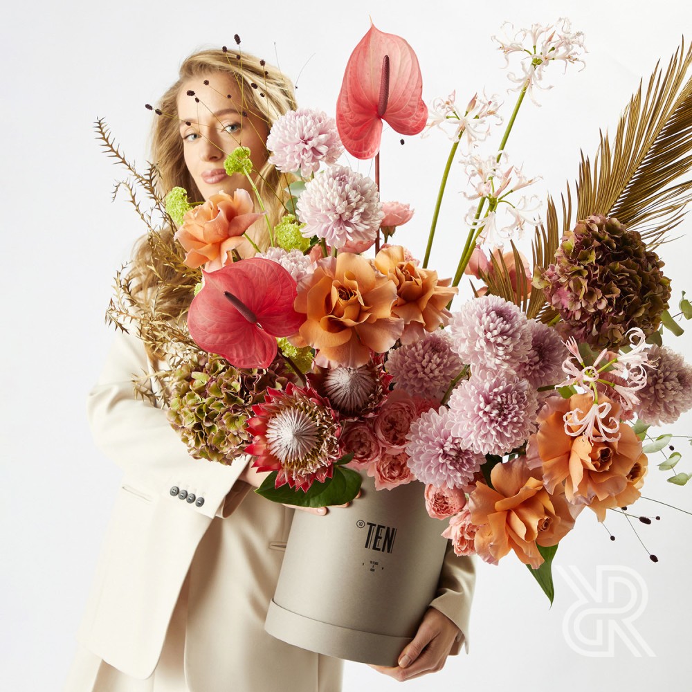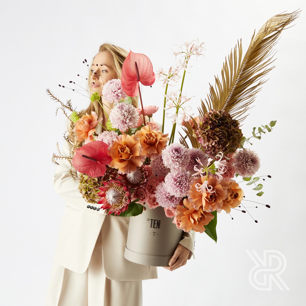 Объемная композиция в коробке в розово-кофейной гамме с золотыми акцентами из коллекции TEN, посвящённой десятилетию ROOTS.